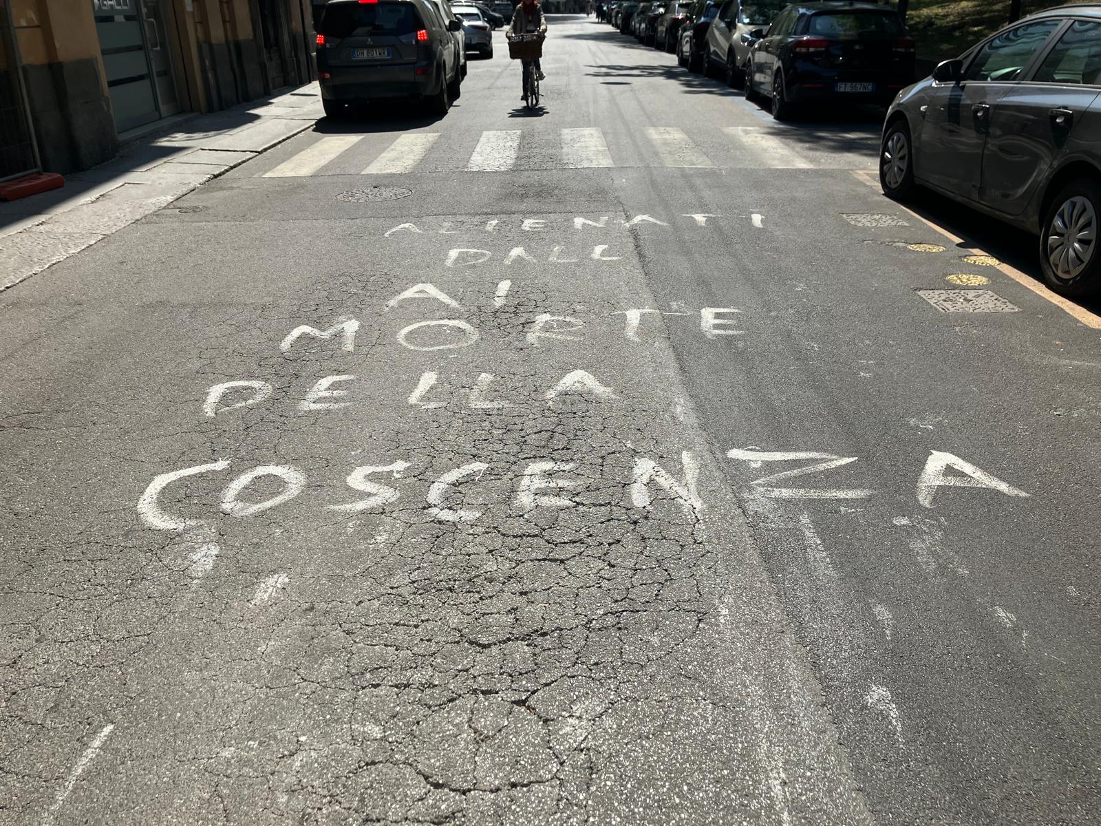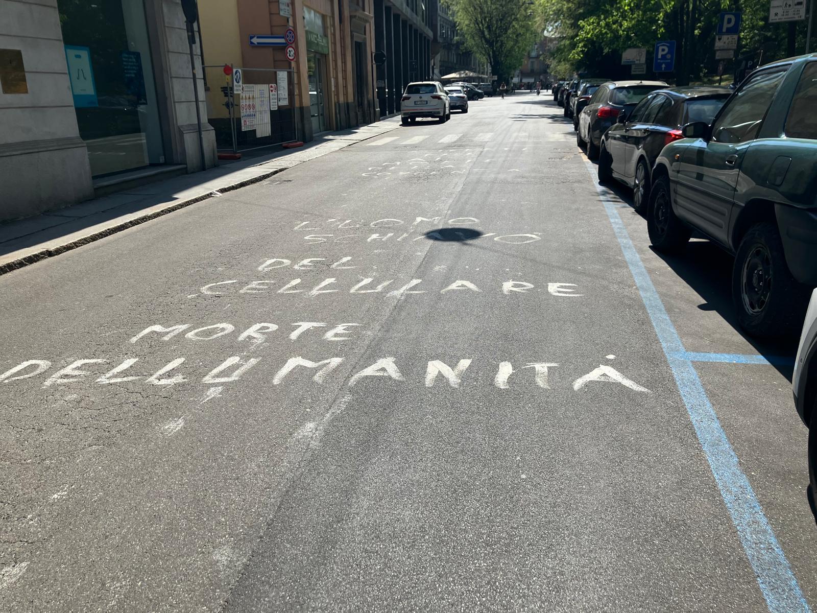 Il centro della carreggiata è stato imbrattato con scritte bianche con riferimenti deliranti all'uso della tecnologia, come i cellulari e l'intelligenza artificiale. Interrogazione di Olzi