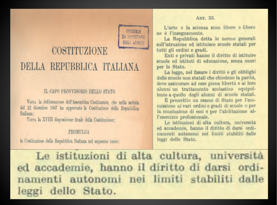 Tra i molti articoli della Costituzione che si soffermano su questo aspetto, gli art. 9 e 33 sono i più espliciti in merito e i più noti, recitando rispettivamente: “La Repubblica promuove lo sviluppo della cultura e la ricerca scientifica e tecnica “ . “L’arte e la scienza sono libere e libero ne è l’insegnamento”.