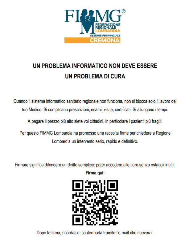 Con la raccolta firme su Change.org la Fimmg chiede a Regione Lombardia un intervento serio, rapido e definitivo, anche perché i problemi vanno avanti da anni dice Bontardelli: “Quando ho iniziato, ormai da più di dieci anni, i problemi sono sempre gli stessi, mai risolti e talvolta sembrano addirittura peggiorare”.