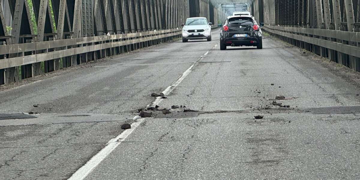 Grossi frammenti di asfalto, veri e propri “sassi”, si sono staccati dalla pavimentazione in corrispondenza di un giunto, costringendo gli automobilisti a fare pericolosi slalom per schivarli. Una situazione non nuova purtroppo per chi abitualmente convive con i rappezzi che saltano ogni volta che piove, soprattutto nella parte piacentina del ponte.