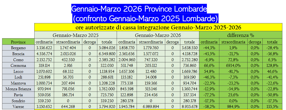 Sorprende il dato cremonese: le ore di CIGS autorizzate dall’Inps (il che non significa che siano state effettivamente utilizzate dalle aziende) nei primi tre mesi di quest’anno sono il 6.934% in più dello stesso periodo del 2025: in cifre assolute, da 2.916 a 202.196, circa 70 volte tanto, quasi esclusivamente dovute alle crisi aziendali nel comparto tessile (111.000 ore) e in quello della chimica – gomma – plastica (93.600). L’Ordinaria è cresciuta del 66,6% passando da 319.114 ore a 322.030. Complessivamente le due voci mostrano un incremento del 128,8%, un valore che colloca la provincia di Cremona tra le quattro peggiori performance della Lombardia, insieme a Varese, Como e Lecco.