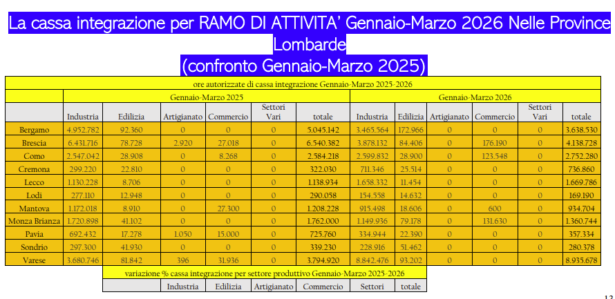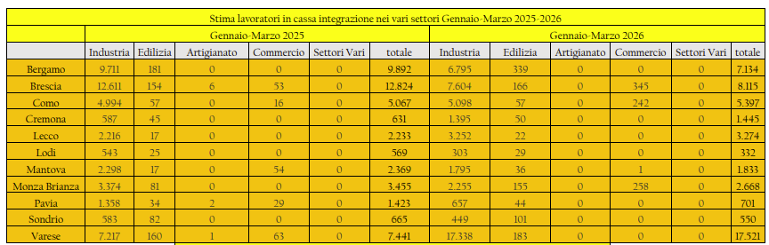 “La situazione di Varese è, senza giri di parole, quella più preoccupante. Ma segnali pesanti arrivano anche da Como, Cremona e Lecco. Quando cresce la cassa integrazione straordinaria, cresce anche il rischio che la riduzione dell’attività lavorativa si trasformi in perdita del posto di lavoro. Resta inoltre fortissima la preoccupazione per gli effetti del conflitto in atto in Medio Oriente, che continua a produrre instabilità sui mercati, sui costi energetici e sulle filiere produttiive. In una regione manifatturiera come la Lombardia, questi fattori possono tradursi rapidamente in nuove difficoltà industriali e occupazionali”.