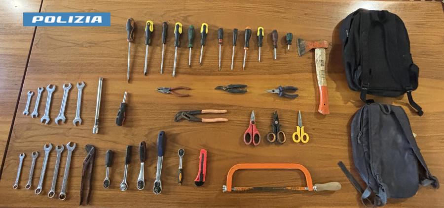 Il secondo uomo, rimasto al volante, ha tentato di ripartire, ma è stato immediatamente inseguito e bloccato dagli agenti. Durante la perquisizione del veicolo, all’interno del bagagliaio sono stati rinvenuti numerosi strumenti potenzialmente utilizzabili per lo scasso: un’ascia, un seghetto, un taglierino, una cesoia, tredici cacciaviti, tre forbici, due pinze, diciassette chiavi tra inglesi e a pappagallo e un prolungamento per bussola.