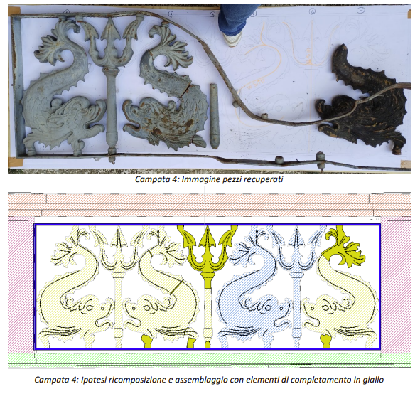 Un progetto che ha dovuto fare i conti sia con il valore storico della balaustra sia con i vincoli ambientali in quanto inserita nel parco del Po e del Morbasco. Buona parte degli elementi decorativi in ghisa che raffigurano delfini erano stati recuperati e da allora custoditi nei magazzini comunali; per questi si prevede il recupero e la ricollocazione secondo il disegno originario su nuovi telai metallici. Le parti realizzate ex novo saranno evidenziate per differenziarle da quelle originarie.