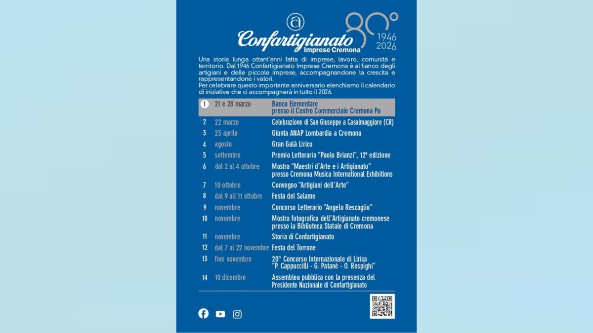 Non un singolo evento, ma un percorso diffuso, capace di toccare solidarietà, cultura, tradizione, musica, memoria storica e partecipazione, nel segno di un’associazione che dal 1946 è punto di riferimento per migliaia di artigiani cremonesi.