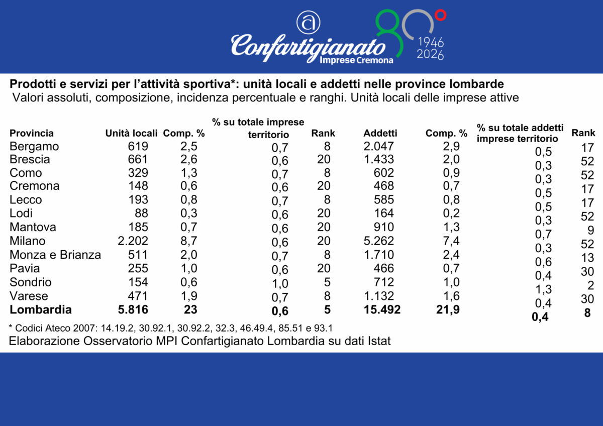 Un’opportunità che riguarda da vicino anche la provincia di Cremona, inserita in un sistema regionale e nazionale in cui la sport economy è sempre più strategica e trainata in modo decisivo dalle micro e piccole imprese.