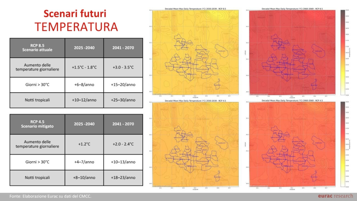 Lo scenario più drastico, ritenuto “probabilmente il più plausibile” dal dott. Luca Cetara di EURAC, prevede un aumento medio delle temperature nel lungo termine fino a 2 o 3 gradi centigradi.