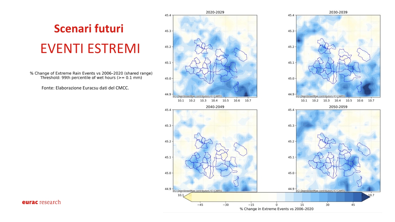 L’aumento degli eventi estremi è stimato tra il 40% e il 60% rispetto al periodo storico (2006-2020), con precipitazioni giornaliere che possono raggiungere i 120 millimetri.
