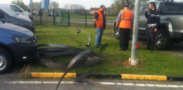 Cronaca 18 Lug 2016 Tir sbanda e perde carico di coils in acciaio. Traffico in tilt su rotonda Ipercoop