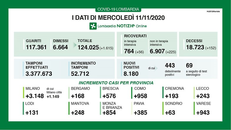 Cronaca 01 Nov 2020 Covid: 8.607 nuovi positivi in Lombardia con 54 decessi. 181 i casi in provincia di Cr