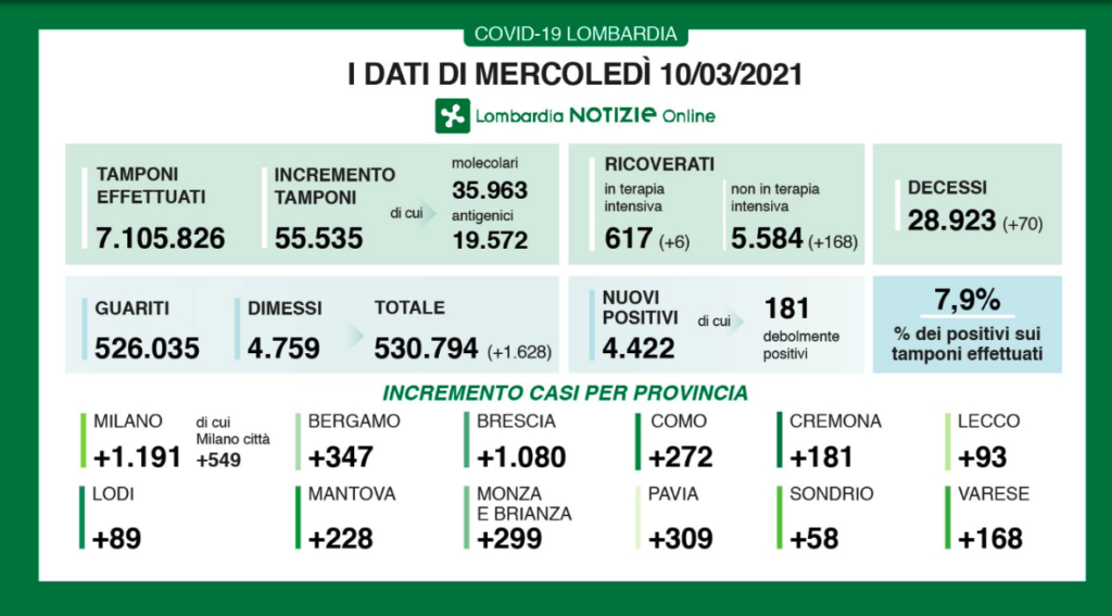 Cronaca 24 Feb 2021 Covid, 83 casi in provincia, 3.310 nuovi positivi in regione Brescia supera Milano